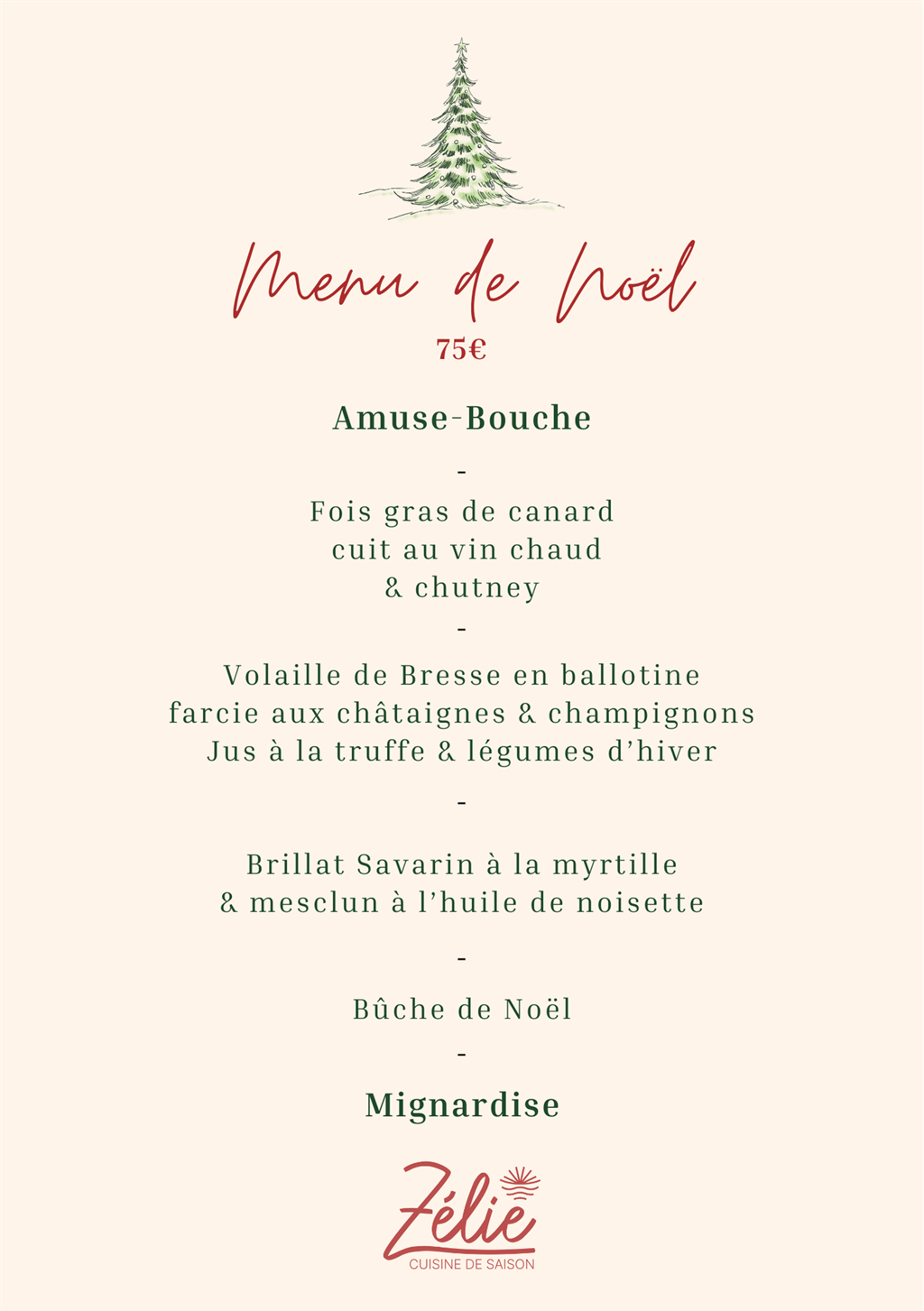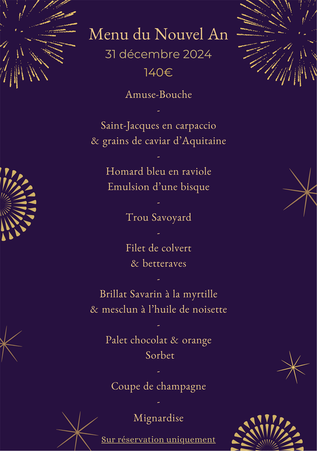 Notre menu de noël pour le diner du mardi 24 décembre et notre menu du Nouvel An pour le diner du mardi 31 décembre