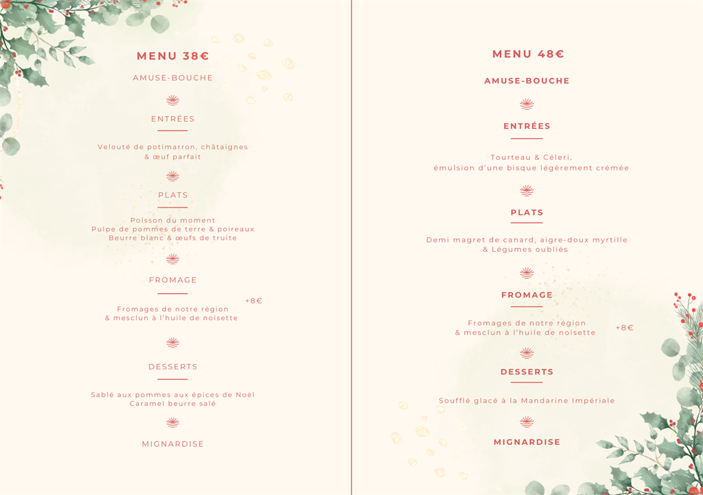 À l'occasion des fêtes de fin d'année, le Chef et son équipe vous propose des menus festifs élaborés à partir de produits frais de saison au restaurant Zélie.