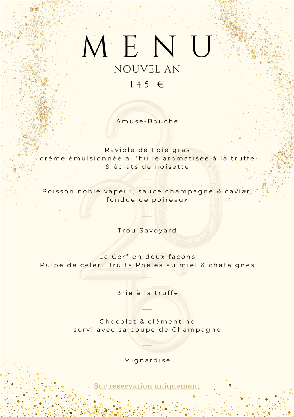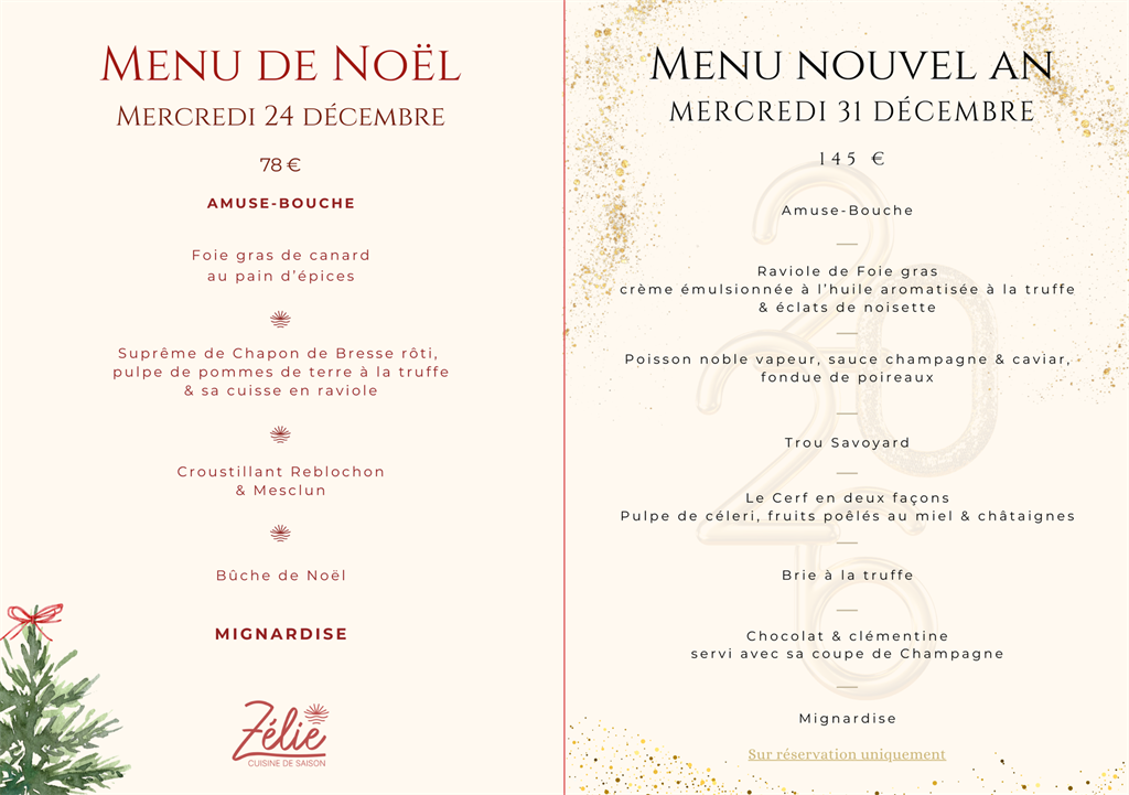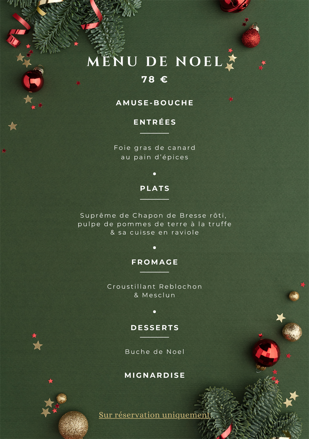Notre menu de noël pour le diner du mercredi 24 décembre et notre menu du Nouvel An pour le diner du mercredi 31 décembre